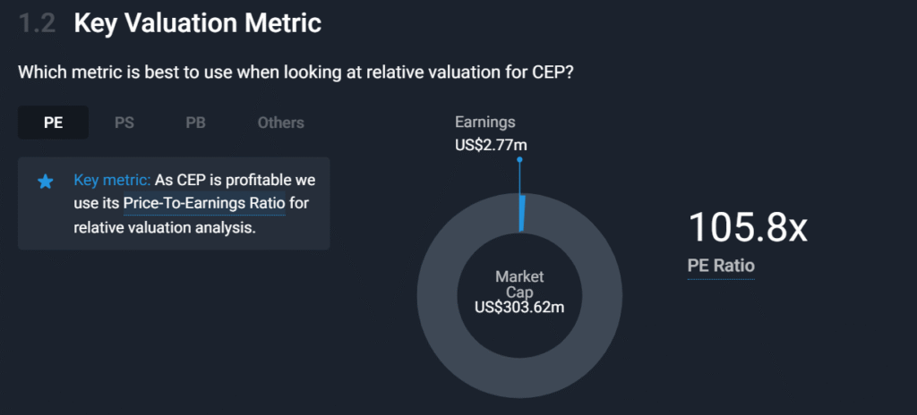 The conventional valuation ratios of CEP Stock Valuation & Forecast Insights are not informative as it is an SPAC. P/E is high (e.g. such as 100x) based on EPS that may include the non-operating profits. Neither Price-to-Sales nor D/E can be applied (no sales), nor is the negative equity distorted.