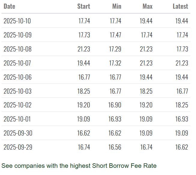 | Borrow fee | ~ 17–19 % APR | Source: Fintel “Short Borrow Fee Rates” component (Fintel) |