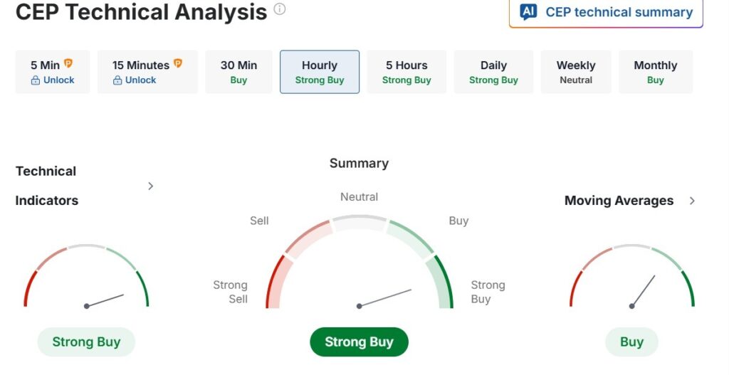 Due to this reason, technical analysis becomes an important tool to explain CEP stock movements. The most important aspects of traders that we will explore in this guide are RSI (Relative Strength Index), support and resistance levels, and other momentum indicators that can be used to determine the direction of the price and trading opportunities. You can also get backtesting information, risk management advice and how to combine technical signals with news about deals, and so it is one of the most comprehensive CEP technical analysis sites on the Internet.